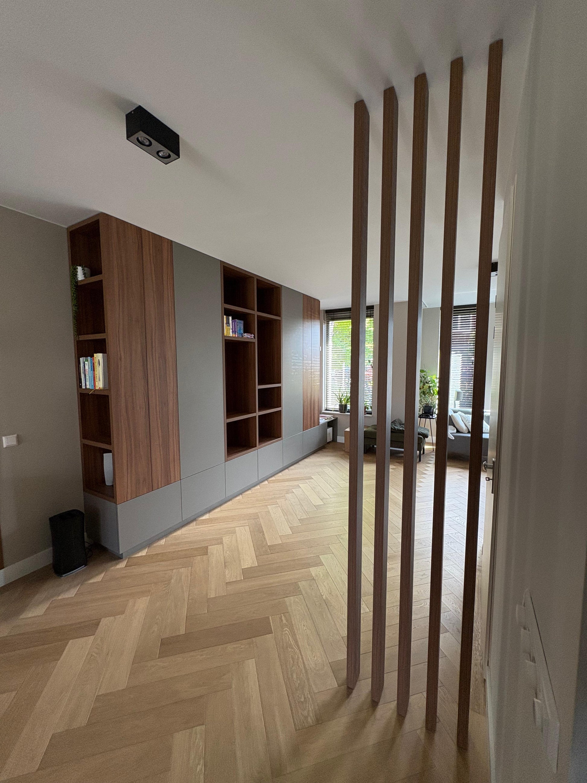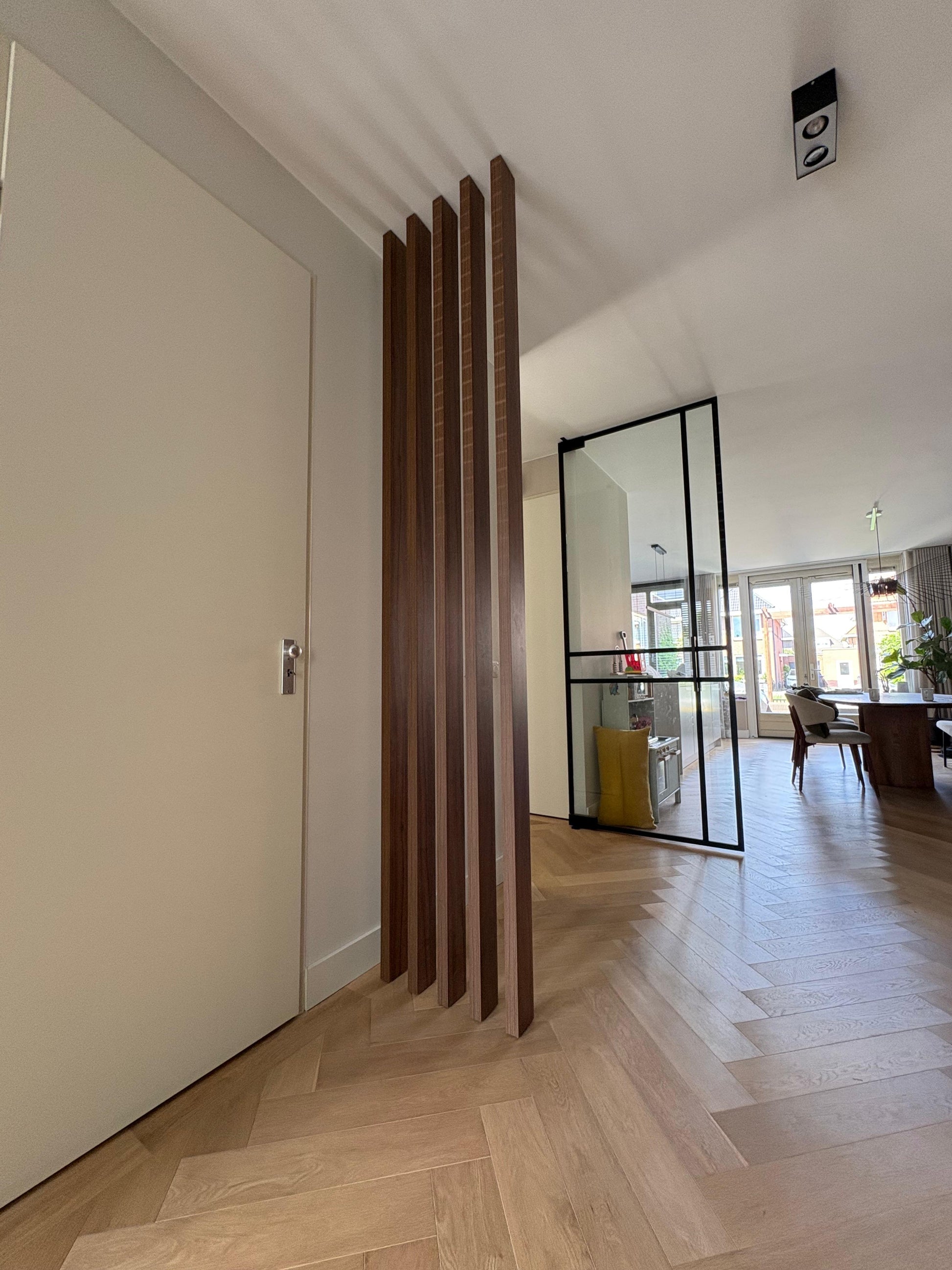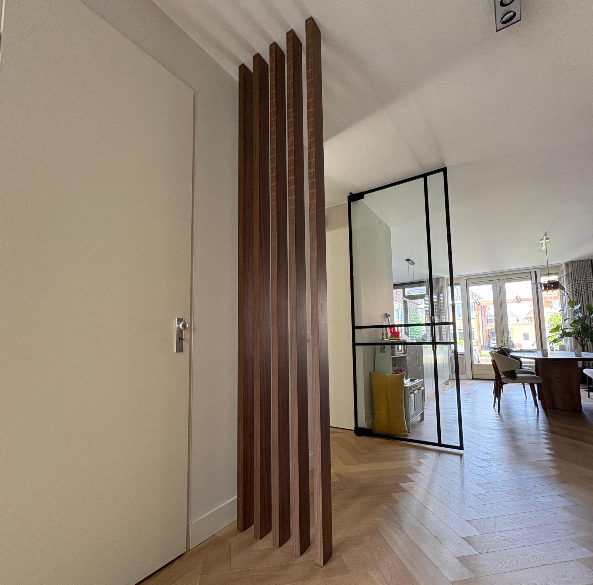 Strak, sfeervol en functioneel: deze lattenwand is een echte blikvanger in het interieur. Met oog voor detail en maatwerk hebben we een subtiele scheiding gecreëerd tussen hal en woonkamer, zonder dat het licht of ruimtelijk gevoel verloren gaat.